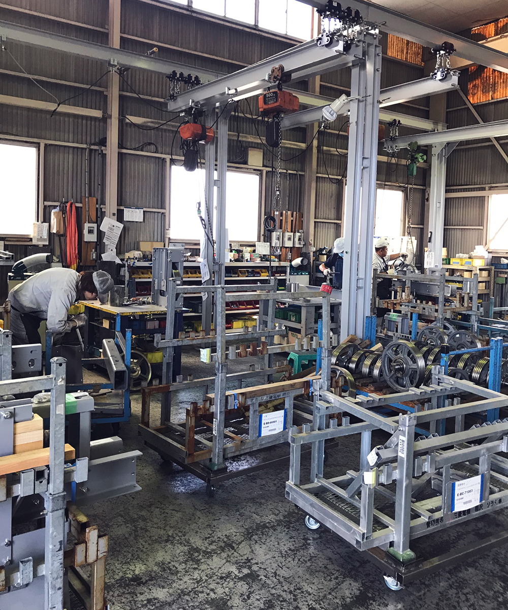 ユニットとして電気配線まで含め組み立て。中小型のものから長さ10mほどの大型設備も組み立て可能。